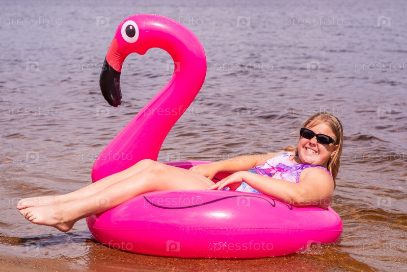 В жаркий летний день ребенок отдыхает на озере. Девочка на пляже. Девушка плавает на надувном розовом фламинго. В знойный летний день ребенок расслабляется на озере. Девушка на пляже. Девушка плывет на надуваемом розовом фламинго