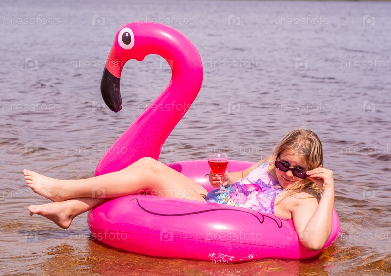 В жаркий летний день ребенок отдыхает на озере. Девочка на пляже. Девушка плавает на надувном розовом фламинго. В знойный летний день ребенок расслабляется на озере. Девушка на пляже. Девушка плывет на надуваемом розовом фламинго