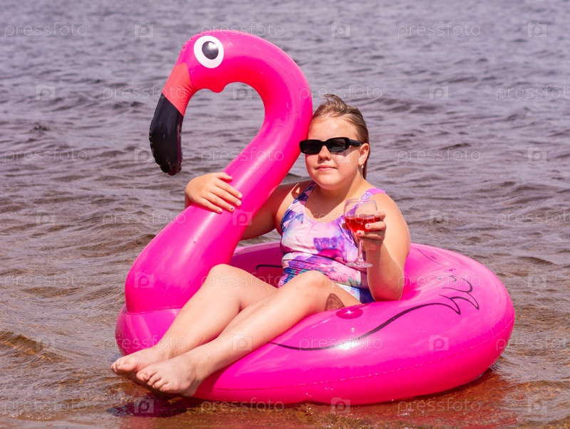 В жаркий летний день ребенок отдыхает на озере. Девочка на пляже. Девушка плавает на надувном розовом фламинго. В знойный летний день ребенок расслабляется на озере. Девушка на пляже. Девушка плывет на надуваемом розовом фламинго