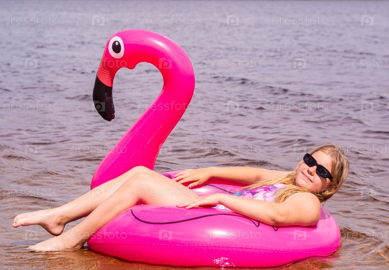 В жаркий летний день ребенок отдыхает на озере. Девочка на пляже. Девушка плавает на надувном розовом фламинго. В знойный летний день ребенок расслабляется на озере. Девушка на пляже. Девушка плывет на надуваемом розовом фламинго