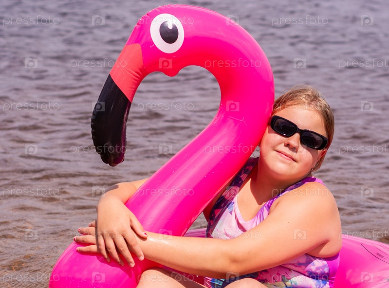 В жаркий летний день ребенок отдыхает на озере. Девочка на пляже. Девушка плавает на надувном розовом фламинго. В знойный летний день ребенок расслабляется на озере. Девушка на пляже. Девушка плывет на надуваемом розовом фламинго