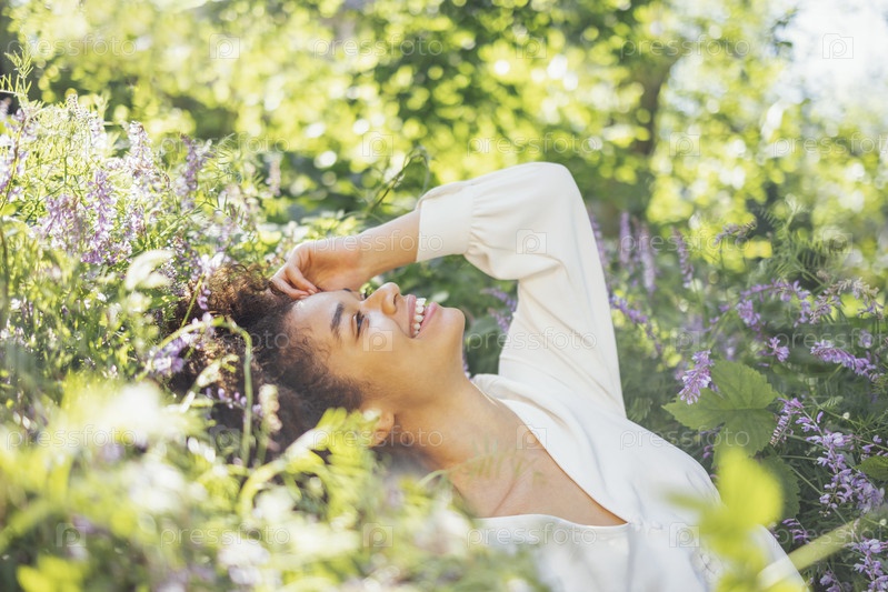 Привлекательная девушка смешанной расы в белом элегантном шифоновом платье сидит среди цветущего фиолетового цветка