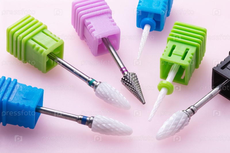 Различные керамические и металлические фрезы для аппаратного маникюра на розовом фоне, крупный план
