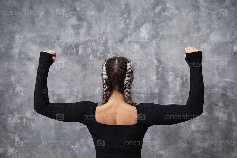 Спортивная женщина тренируется возле стены, стоит спиной к камере, сгибает руки под прямым углом и разводит их в стороны, укрепляет мышцы спины и плеч