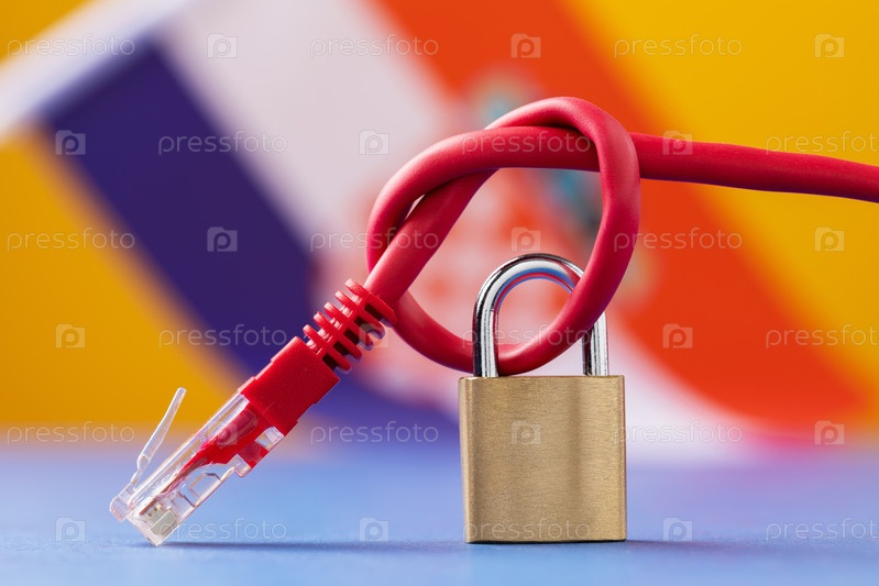Закрытый замок на связанном сетевом проводе в узел на фоне хорватского флага, концепция безопасности интернет-технологий в стране