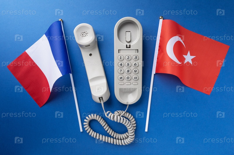 Флаг Франции, Турции и старый проводной телефон на синем фоне, концепция на тему телефонных разговоров между странами