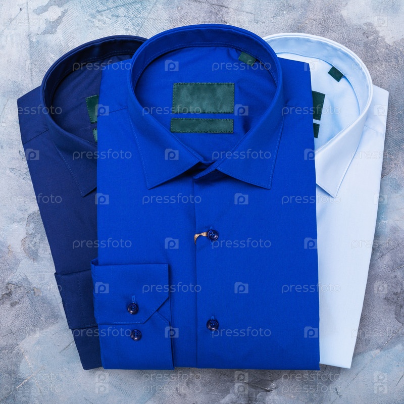 Три синие рубашки разных оттенков на абстрактном фоне, вид сверху
