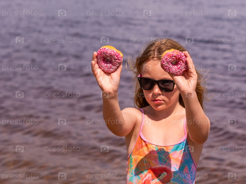 В жаркий летний день ребенок отдыхает на озере. Девочка на пляже. Девушка держит в руках розовый пончик. В знойный летний день ребенок расслабляется у озера. Девушка на пляже. Девушка держит в руках розовую поничку