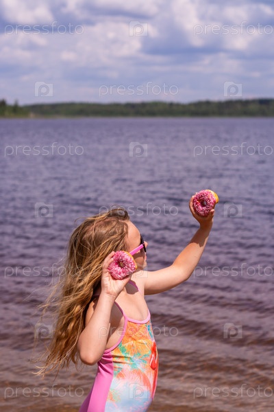 В жаркий летний день ребенок отдыхает на озере. Девочка на пляже. Девушка держит в руках розовый пончик. В знойный летний день ребенок расслабляется у озера. Девушка на пляже. Девушка держит в руках розовую поничку