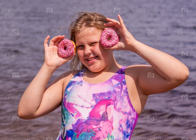 В жаркий летний день ребенок отдыхает на озере. Девочка на пляже. Девушка держит в руках розовый пончик. В знойный летний день ребенок расслабляется у озера. Девушка на пляже. Девушка держит в руках розовую поничку