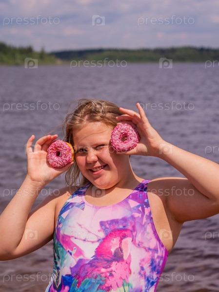 В жаркий летний день ребенок отдыхает на озере. Девочка на пляже. Девушка держит в руках розовый пончик. В знойный летний день ребенок расслабляется у озера. Девушка на пляже. Девушка держит в руках розовую поничку