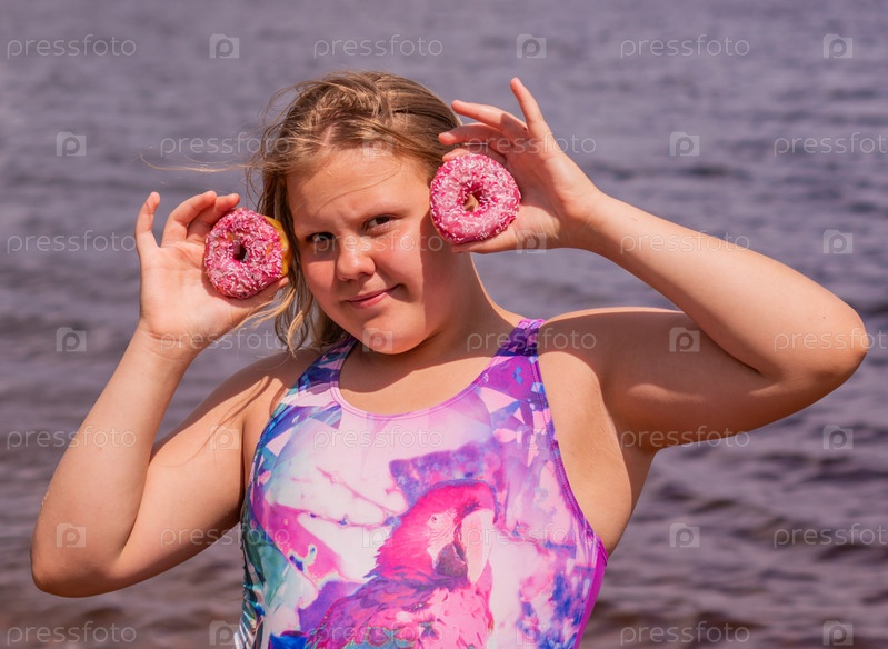 В жаркий летний день ребенок отдыхает на озере. Девочка на пляже. Девушка держит в руках розовый пончик. В знойный летний день ребенок расслабляется у озера. Девушка на пляже. Девушка держит в руках розовую поничку