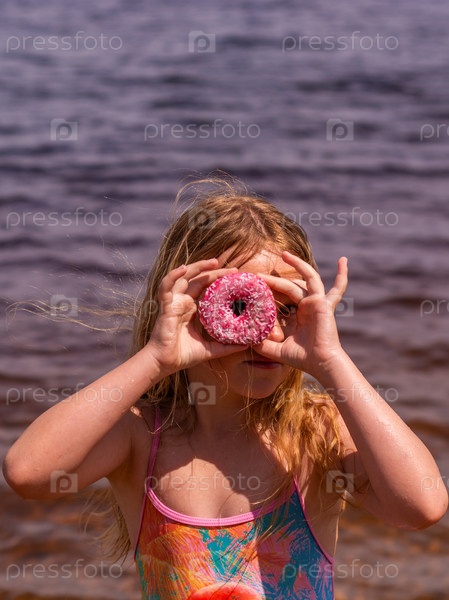 В жаркий летний день ребенок отдыхает на озере. Девочка на пляже. Девушка держит в руках розовый пончик. В знойный летний день ребенок расслабляется у озера. Девушка на пляже. Девушка держит в руках розовую поничку