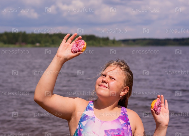 В жаркий летний день ребенок отдыхает на озере. Девочка на пляже. Девушка держит в руках розовый пончик. В знойный летний день ребенок расслабляется у озера. Девушка на пляже. Девушка держит в руках розовую поничку