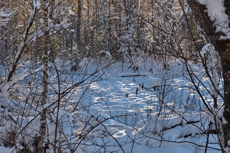 Вид на таежное болото с кочками покрытыми снегом в лучах закатного солнца