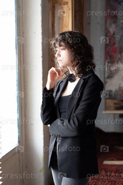 Портрет молодой красивой женщины с вьющимися волосами в студии