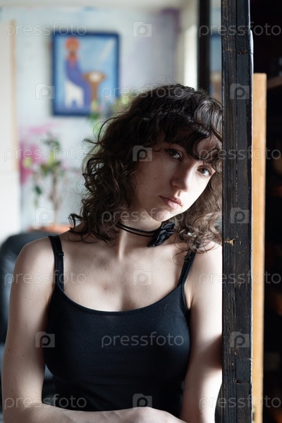 Портрет молодой красивой женщины с вьющимися волосами в студии