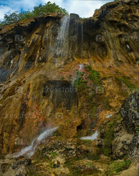 Россия. Кабардино-Балкария. Вид на необычный водопад на реке Гедмышх, имеющий название 70 струй и Царской Короны