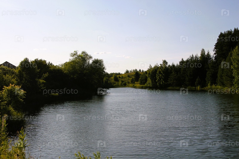 Лесное озеро, летний пейзаж с озером под солнцем
