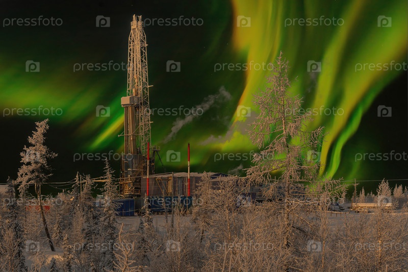 Буровая установка и северный пейзаж нефтегазового месторождения на фоне полярного сияния. Пейзаж с красивым ночным небом зимой в Арктике