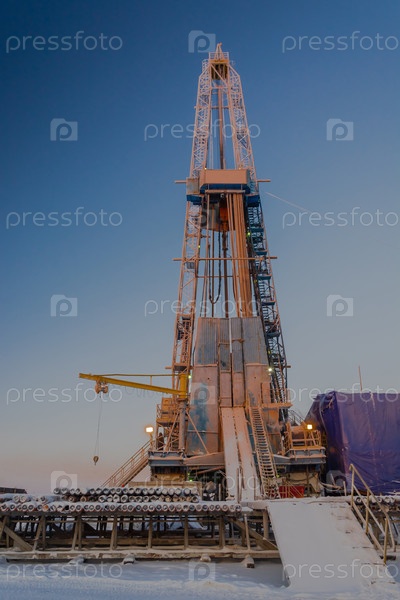 Буровая установка на северном нефтегазовом месторождении. Зимний полярный день. Оборудование и бурильные трубы покрыты снегом