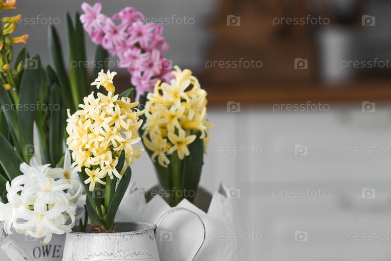 Весенние цветы гиацинта на белом столе. На заднем плане — белая кухня в скандинавском стиле. Весенний декор в доме