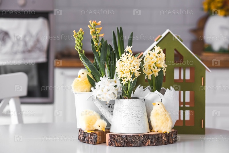 Христос воскрес. Весенние желтые цветы гиацинта в яйцеобразной вазе, куриные цыплята на белом столе. На заднем плане — белая кухня в скандинавском стиле. Пасхальный декор в доме