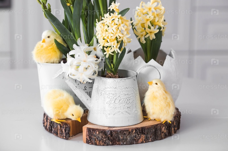 Христос воскрес. Весенние желтые цветы гиацинта в яйцеобразной вазе, куриные цыплята на белом столе. На заднем плане — белая кухня в скандинавском стиле. Пасхальный декор в доме