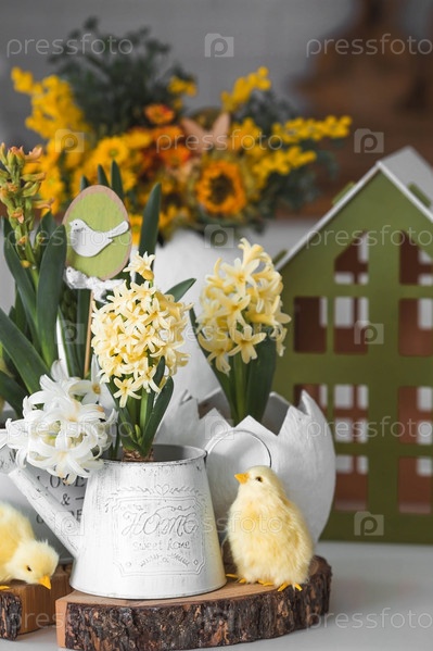 Христос воскрес. Весенние желтые цветы гиацинта в яйцеобразной вазе, куриные цыплята на белом столе. На заднем плане — белая кухня в скандинавском стиле. Пасхальный декор в доме