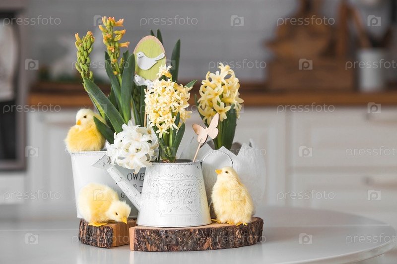 Христос воскрес. Весенние желтые цветы гиацинта в яйцеобразной вазе, куриные цыплята на белом столе. На заднем плане — белая кухня в скандинавском стиле. Пасхальный декор в доме