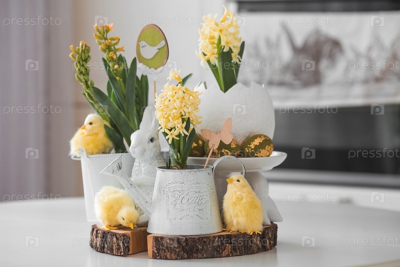 Христос воскрес. Весенние желтые цветы гиацинта в яйцеобразной вазе, куриные цыплята на белом столе. На заднем плане — белая кухня в скандинавском стиле. Пасхальный декор в доме