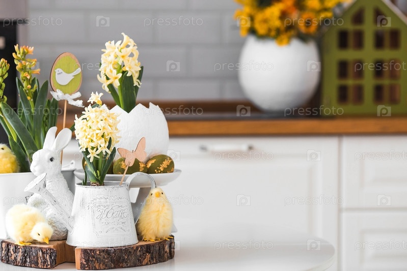 Христос воскрес. Весенние желтые цветы гиацинта в яйцеобразной вазе, куриные цыплята на белом столе. На заднем плане — белая кухня в скандинавском стиле. Пасхальный декор в доме