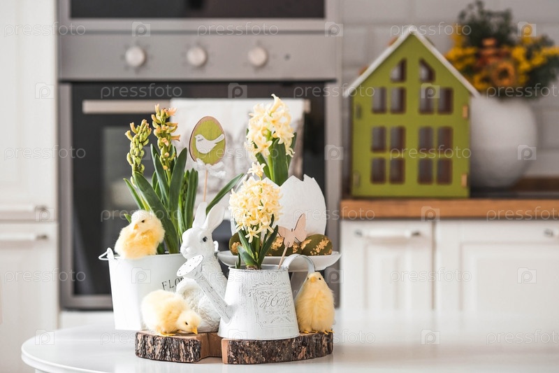 Христос воскрес. Весенние желтые цветы гиацинта в яйцеобразной вазе, куриные цыплята на белом столе. На заднем плане — белая кухня в скандинавском стиле. Пасхальный декор в доме