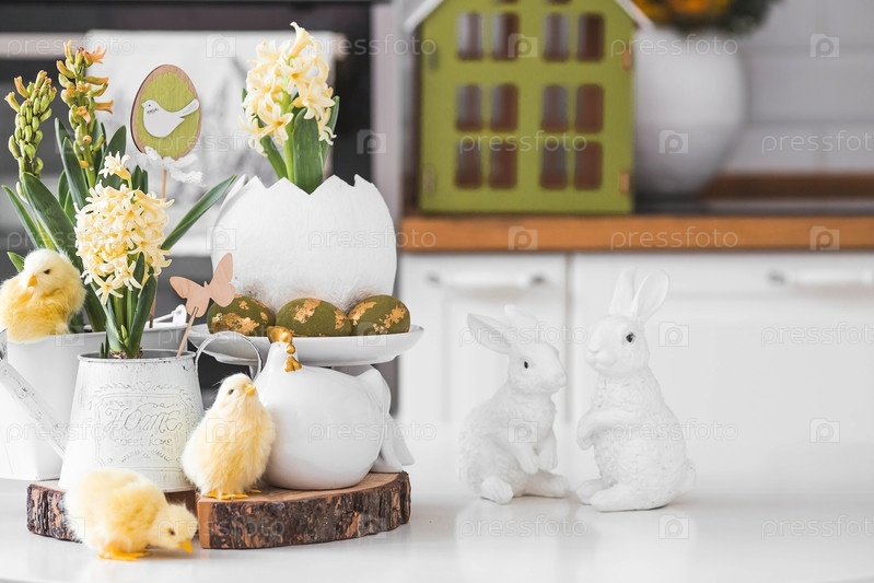 Христос воскрес. Весенние желтые цветы гиацинта в яйцеобразной вазе, куриные цыплята на белом столе. На заднем плане — белая кухня в скандинавском стиле. Пасхальный декор в доме