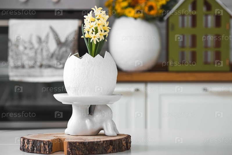 Христос воскрес. Весенние желтые цветы гиацинта в яйцеобразной вазе, куриные цыплята на белом столе. На заднем плане — белая кухня в скандинавском стиле. Пасхальный декор в доме