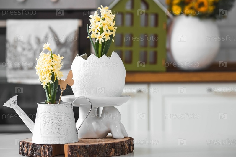Христос воскрес. Весенние желтые цветы гиацинта в яйцеобразной вазе, куриные цыплята на белом столе. На заднем плане — белая кухня в скандинавском стиле. Пасхальный декор в доме