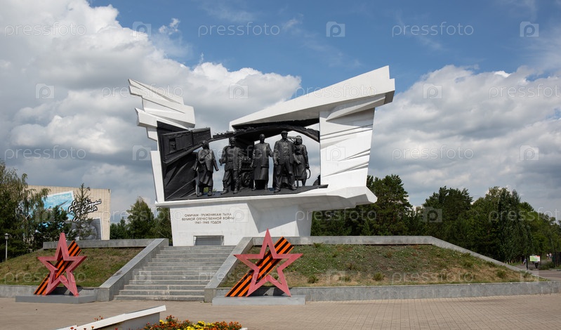 Скульптурная композиция омских тружеников тыла Великой Отечественной войны 1941-1945 годов в центре Омска летом