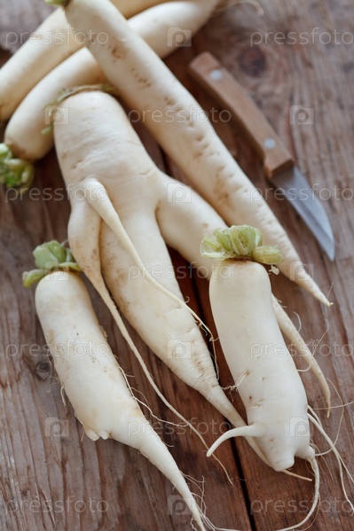Дайкон на фоне древесины