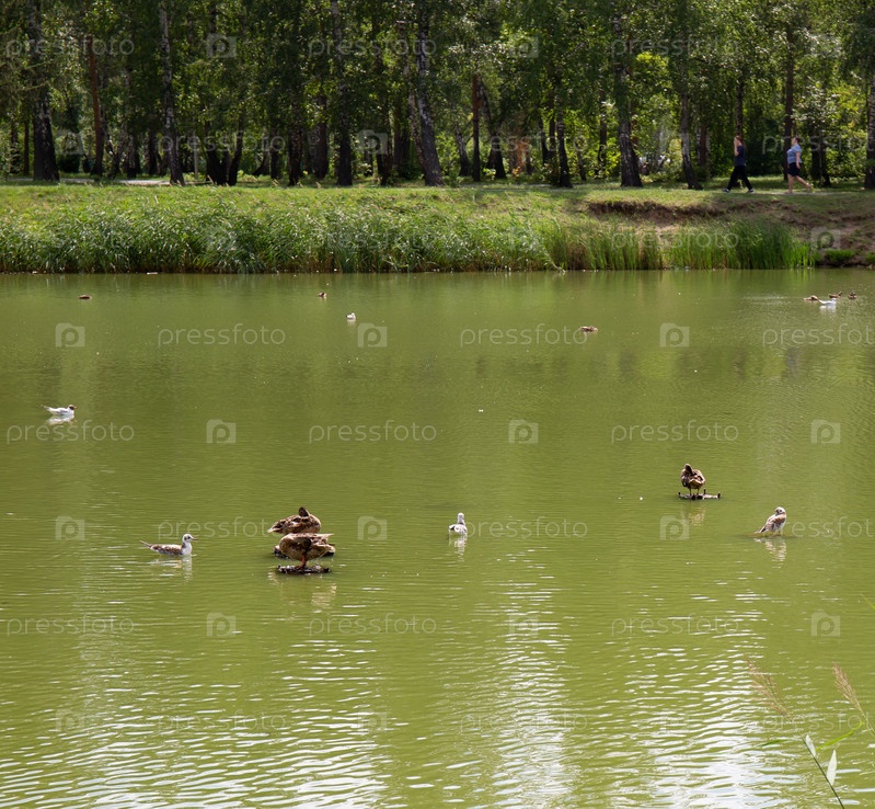 Водоплавающие птицы в старом озере в парке имени 30-летия ВЛКСМ города Омска летом