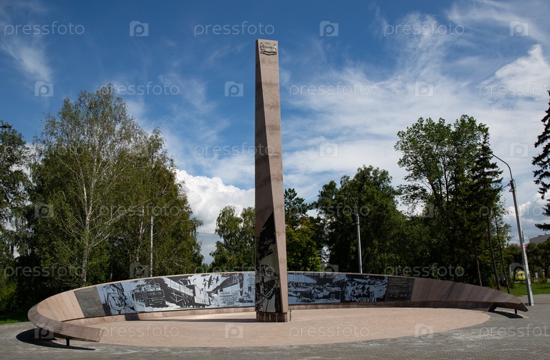 Историческая стела Город трудовой доблести в центре Омска летом