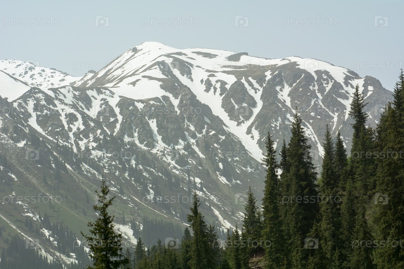 Еловые вершины, горный лес на фоне заснеженных скал