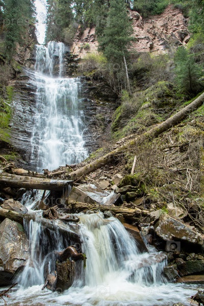 Горный водопад в лесу Кыргызстана. Центральная Азия,