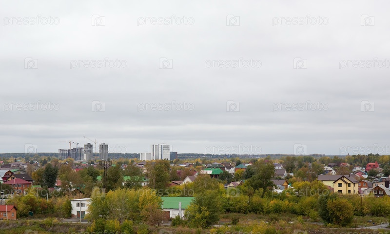 Вид на другой берег реки Туры с гранитной набережной Тюмени осенью