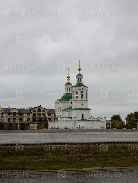 Вид на другой берег реки Туры с гранитной набережной Тюмени осенью