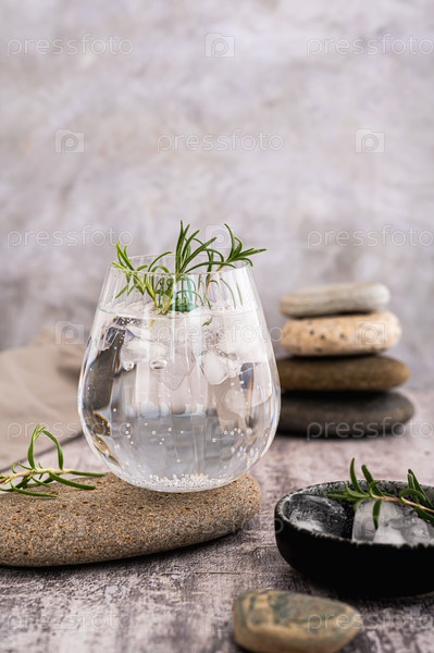 Джин-тоник со льдом и розмарином в стакане на камне на столе, вертикальный вид
