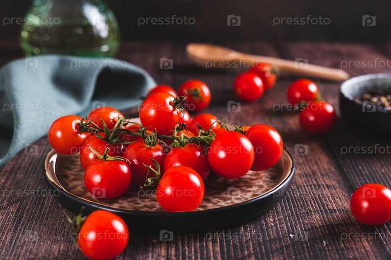 Ветка свежих спелых помидоров черри на тарелке на столе