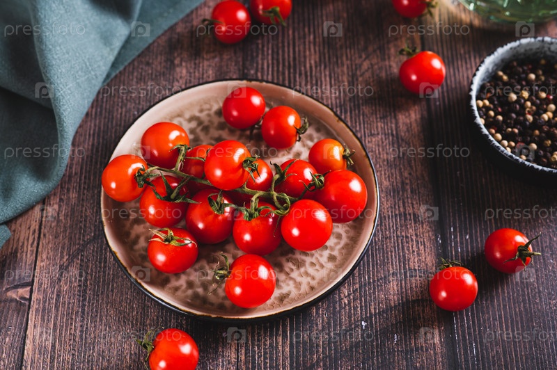 Тарелка со свежими помидорами черри на деревянном столе