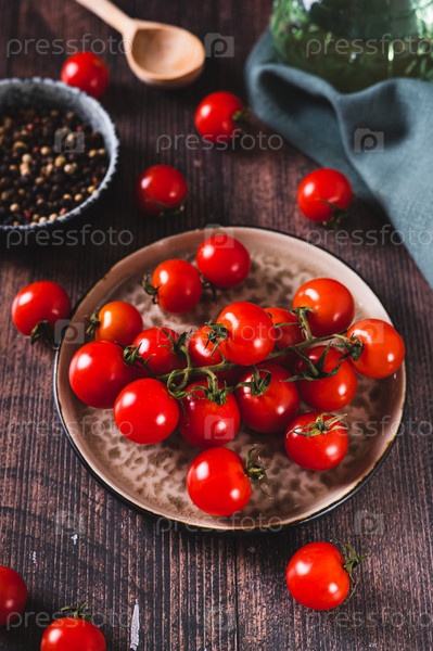 Тарелка со свежими помидорами черри на деревянном столе, вертикальный вид