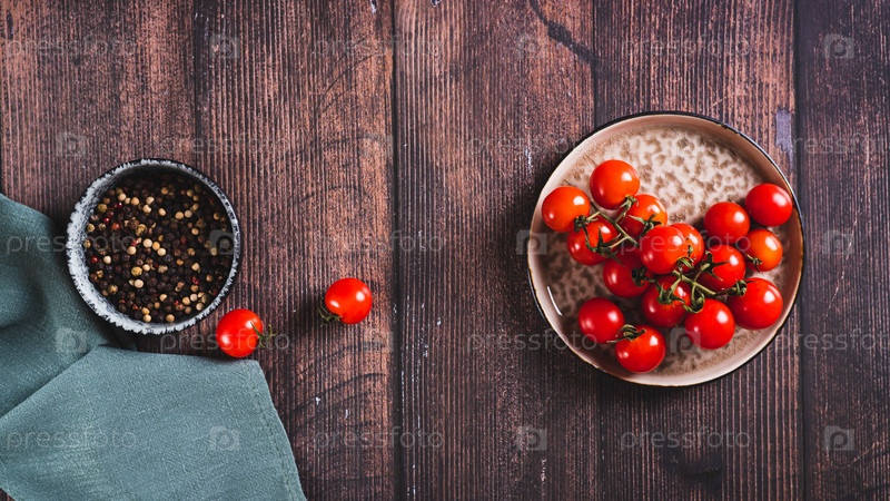 Тарелка со свежими помидорами черри на деревянном столе, вид на веб-баннер