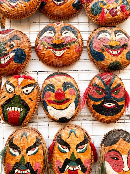 Стена из масок с гримасами